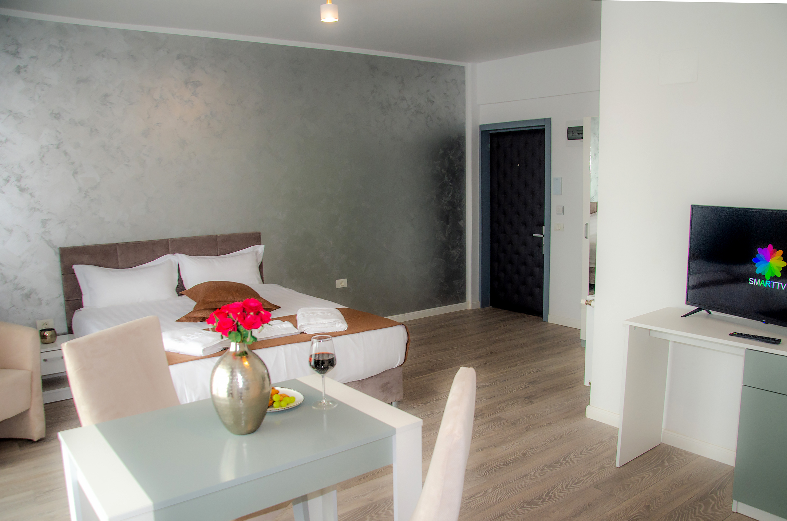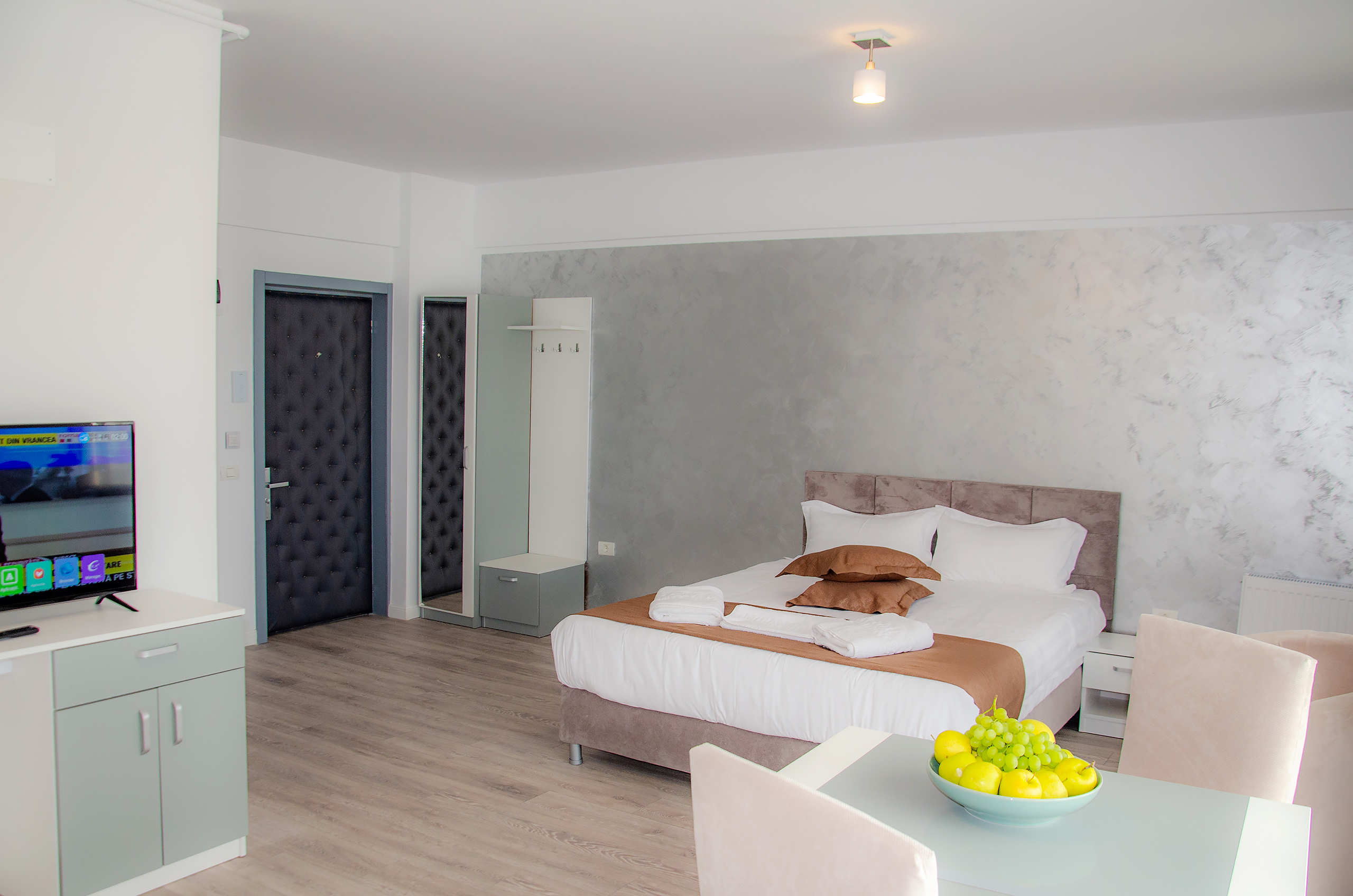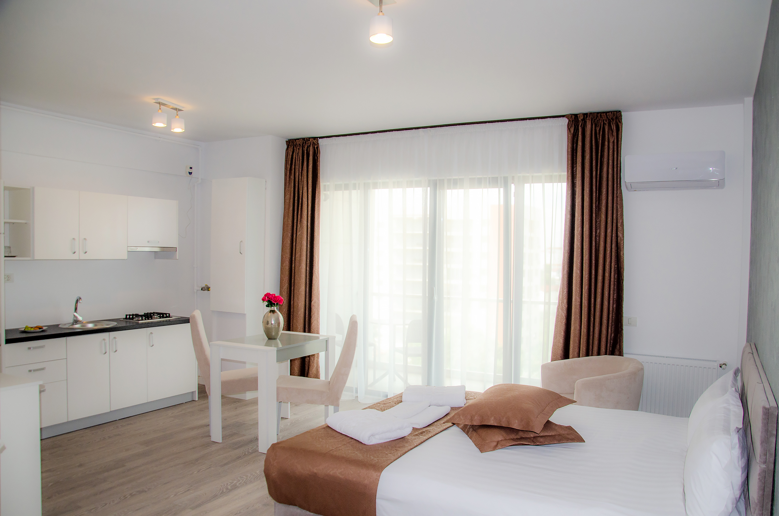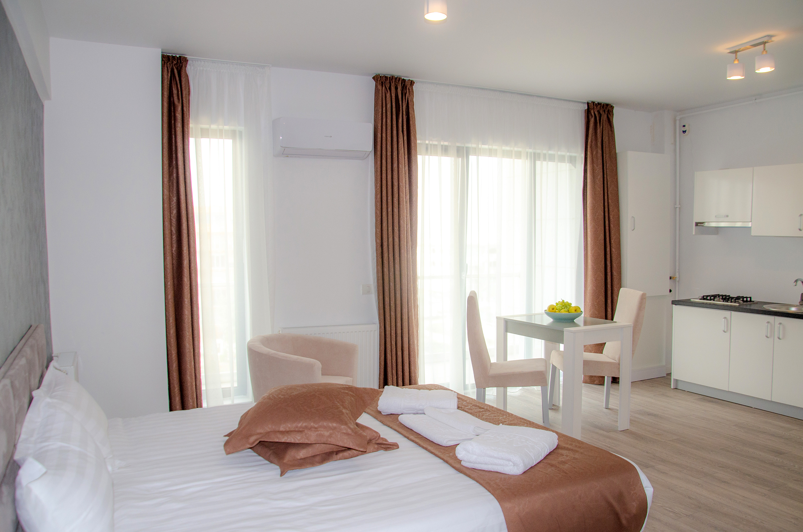 Garsoniera dispune de un pat matrimonial de 160 x 200 si o bucatarie cu zona de pregatit si de luat masa. La cerere, se poate adauga pat suplimentar pliant. O alegere buna pentru sejururi de vacanta in doi, weekenduri de vara si chiar pentru deplasari de business in zona, garsonierele din Miramare Residence au un design chic, sunt confortabile si au toate facilitatile incluse. Accesul se face cu liftul
